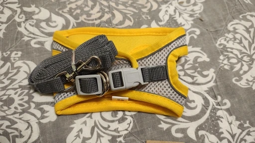 Très belle couleur du harnais et de la laisse. J'ai choisi la taille 2,5-4kg, mon chien pèse 3kg, mais le harnais lui est très serré, le velcro n'est presque pas fermé. En général je dirais que ce modèle est plus adapté aux chats, pour les chiens il faut quelque chose de plus anatomique. C'est vraiment cool qu'il soit réfléchissant. La livraison a été très longue.