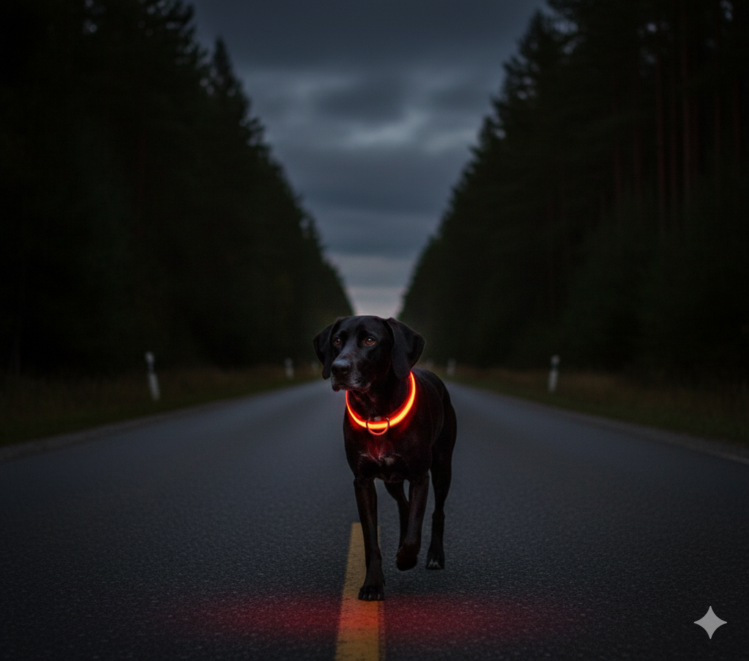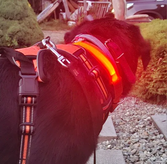 Pour les chiens qui tirent, nous recommandons de porter ce collier lumineux en complément de votre harnais habituel.