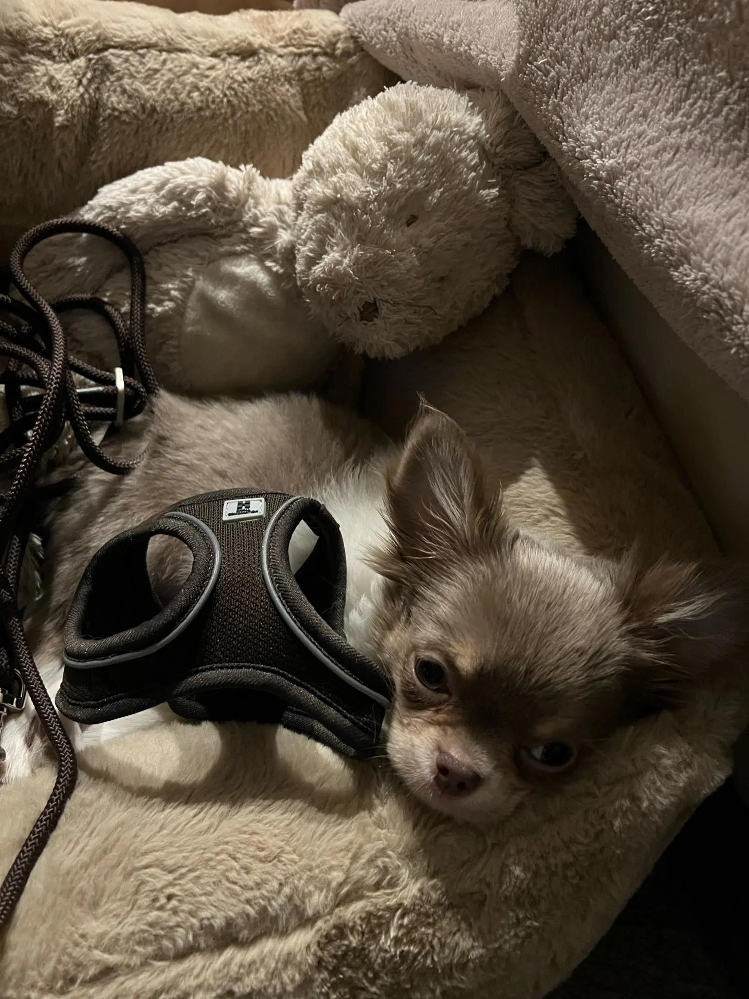 Great quality, brown color is lovely, size XXS fits a chihuahua puppy up to 2kg. I bought a larger size XS as a backup because they are great, super easy to put on, do not restrict the dog's movements. I recommend it and thank you, the leash is short, typical for the city, very nice. Great quality!!